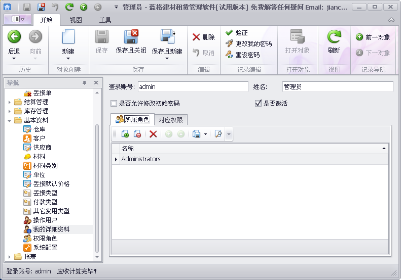 蓝格建材租赁软件-基础资料-我的详细资料的介绍,此功能可以查看当前用户的详细资料,如下图可以查看管理员的详细资料: